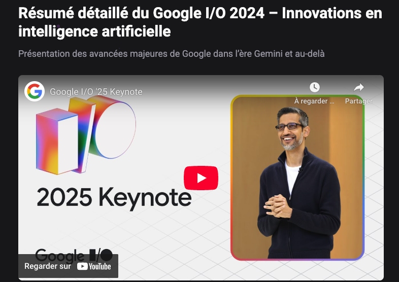 Le Google I/O 2024 a été marqué par des annonces majeures autour de l’intelligence artificielle, reposant sur la nouvelle génération de modèles Gemini. Sundar Pichai et Demis Hassabis ont exposé l’évolution rapide des modèles et produits d’IA de Google, ainsi que les avancées en infrastructure, multimodalité, agents intelligents, personnalisation, recherche, création multimédia, et nouveaux dispositifs matériels.